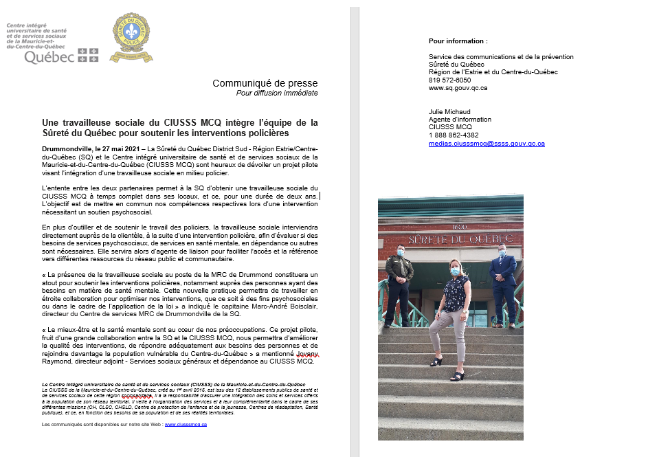 La Sûreté du Québec District Sud - Région Estrie/Centre-du-Québec (SQ) et le Centre intégré universitaire de santé et de services sociaux de la Mauricie-et-du-Centre-du-Québec (CIUSSS MCQ) sont heureux de dévoiler un projet pilote visant l'intégration d'une travailleuse sociale en milieu policier.